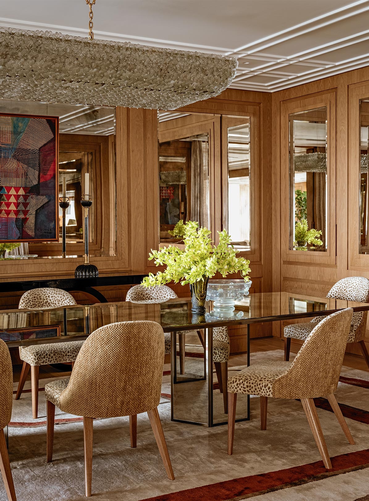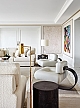 O espaço está cheio de bouclé e veludos, com quase nada mais colorido do que uma poltrona ocre e um sofá chocolate, e mesmo assim há muito para o olhar descobrir — tudo duplicado em uma parede espelhada atrás de uma lareira de mármore. Na casa Regina, a única “cor” na sala de estar branca vem da arte, mas detalhes como metais misturados e tons de madeira fornecem contraste.