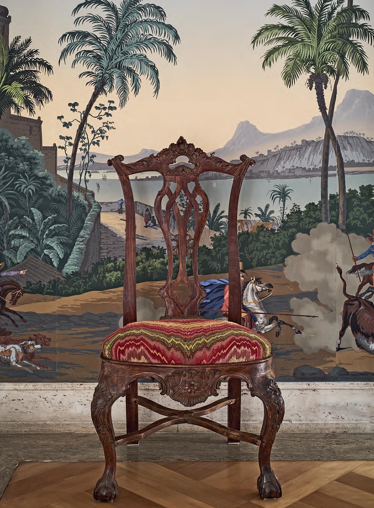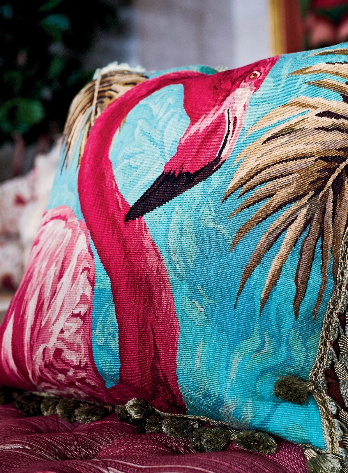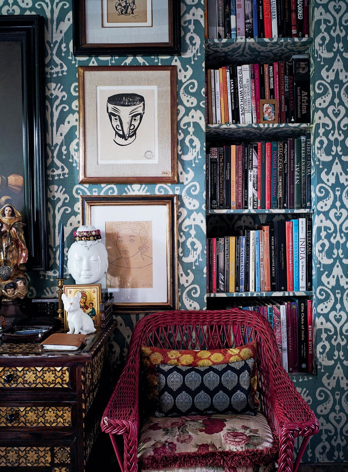 Sempre há folhagens ou flores, uma camada a mais que ajuda até uma casa recém-construída a parecer vivida. Ele adora estampas, mas não precisa que sejam gritantes; usa com confiança xadrezes, animais e estampas abstratas dentro de uma residência.