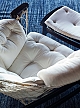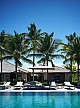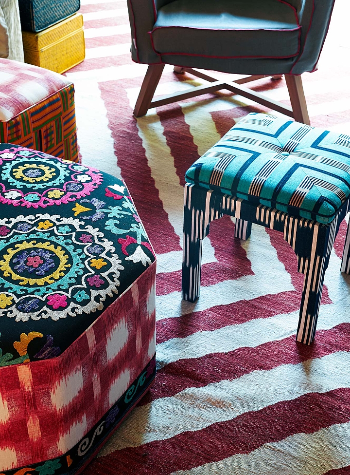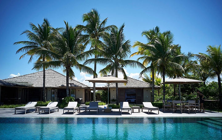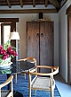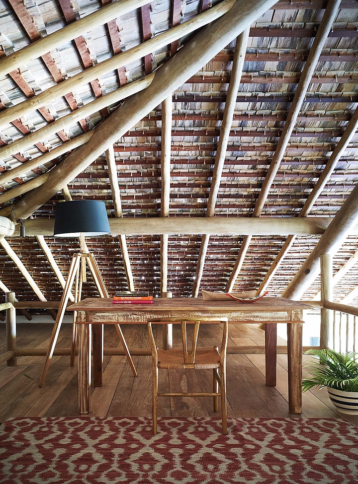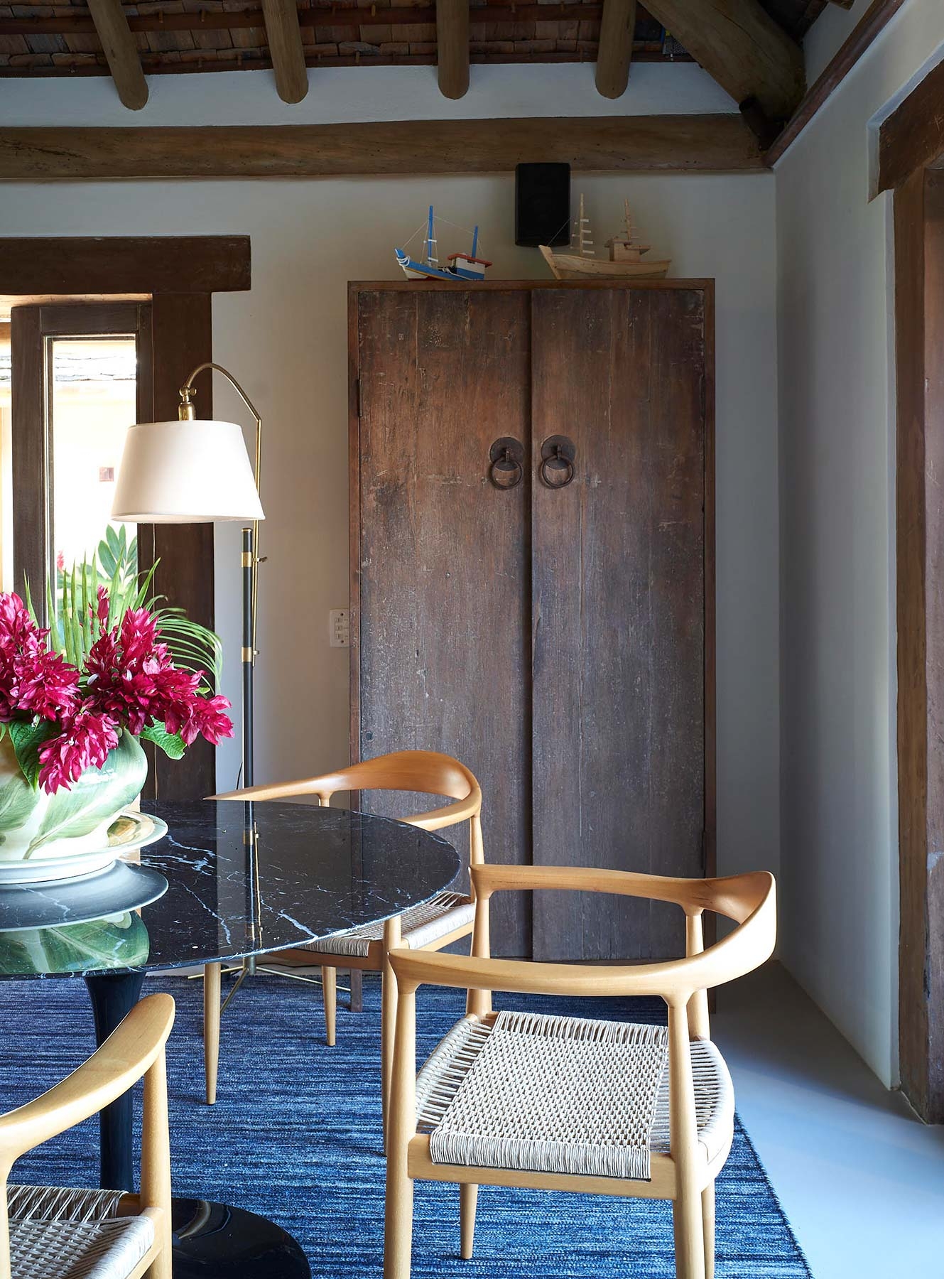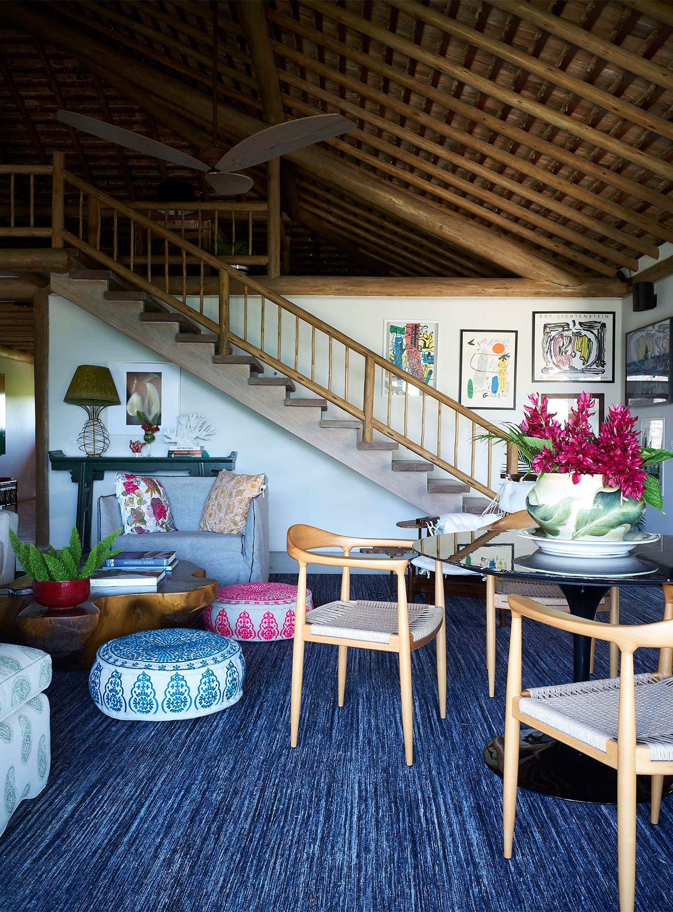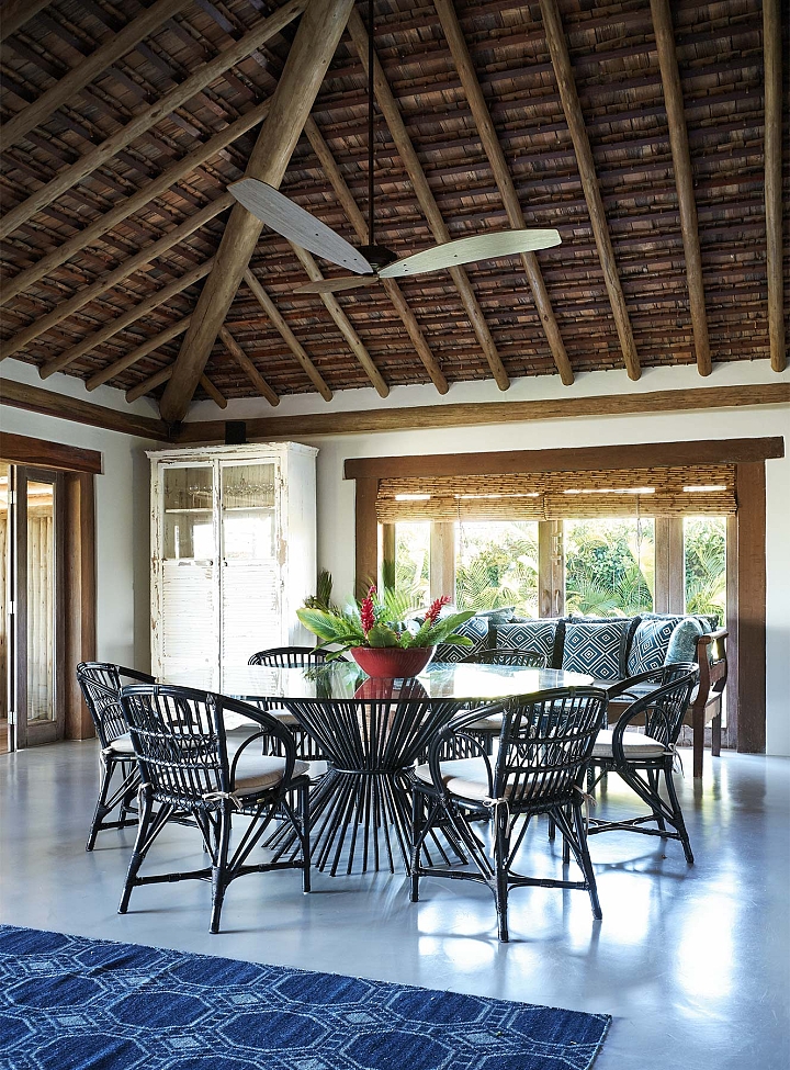 In Trancoso, this beachfront home begins with a clear premise: letting tropical architecture shape the way of living. Exposed timber structure, cross ventilation, and fluid transitions between indoors and outdoors keep the house in continuous dialogue with the landscape. A roof built from rustic timber logs establishes the material vocabulary from the moment of arrival. Inside, the language combines Brazilian modernism, craftsmanship, and everyday use with precise editing. In the main living room, generous upholstery is layered with ikats and ethnic florals, composed with white linen and tapestry. The curation brings together Brazilian design pieces, including an armchair by Sergio Rodrigues, patinated millwork, solid-wood furniture, handwoven textures, organically shaped tables, and collected objects. Wicker, basketry, and contemporary Brazilian design enter as a counterpoint of texture and scale. Natural-fiber rugs, often layered over kilims, organize the rooms; bamboo shades filter the light and reinforce the beachside atmosphere. A palette of white, blue, and controlled accents extends the reading of the surroundings. In the powder room, a handcrafted ceramic sink with hand-applied glazing and figurative elements takes center stage, set against classically designed metal fixtures. The result is a home where architecture and interiors operate as a single system, rustic in materiality, precise in curation, and deeply connected to place.