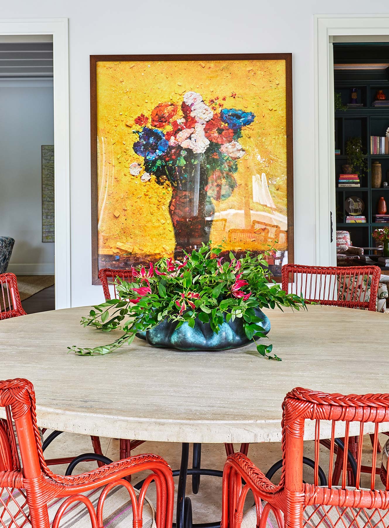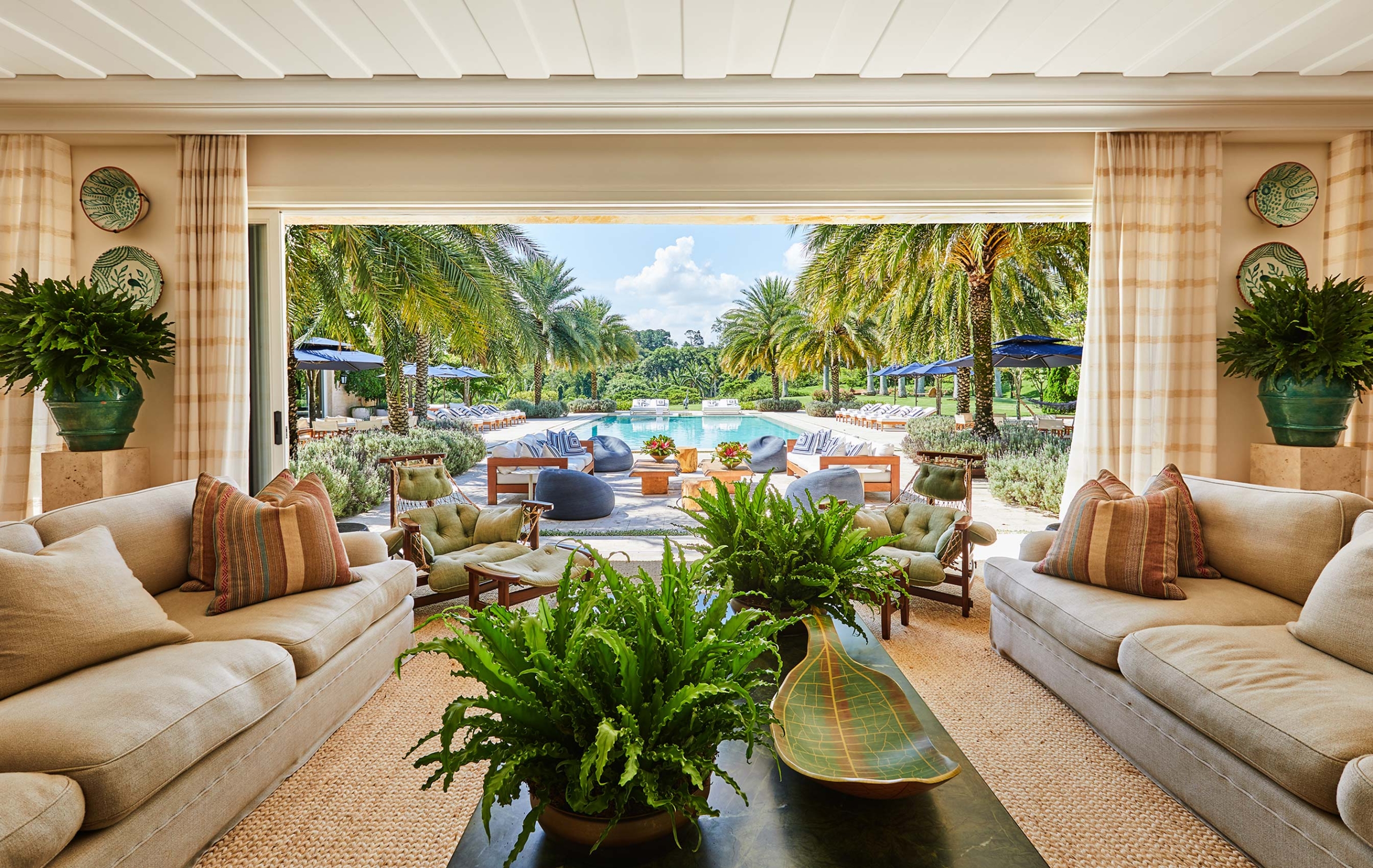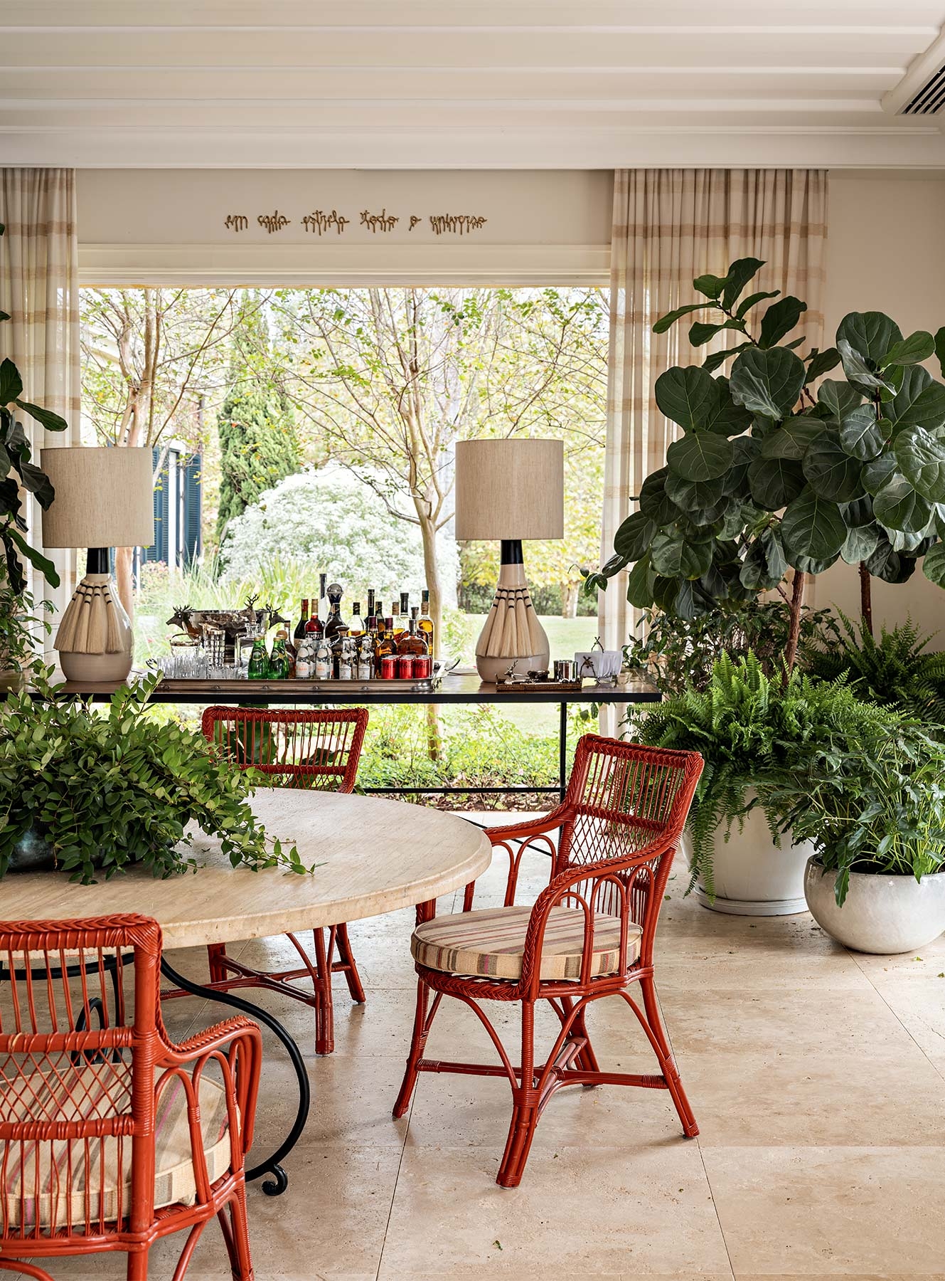 Set within the landscape of Fazenda Boa Vista, Vila Sole organizes its interior design through a dialogue between classical European references and Brazilian design, structuring art, furniture, and materials in continuity with the architecture. The entrance hall establishes the tone of the house with L’EDEN wallpaper by de Gournay, which envelops the space, while a black-and-white marble floor in a traditional checkerboard pattern introduces a graphic, classical foundation. The Rio chaise by Oscar Niemeyer serves as the focal point, and the space was selected to appear in Eclectic by Sig Bergamin, published by Assouline. In the social areas, integration with the garden guides the layout, combining upholstered pieces with furniture by Jader Almeida and Sergio Rodrigues, alongside sisal rugs, handcrafted ceramics, and collected objects. The art curation includes works by Mariana Palma and Cássio Vasconcellos. The dining room features woven-fiber and wood chairs, while the bedrooms maintain floral wallpapers, solid wood furniture, and quilted check textiles. In the pool area, wooden furnishings and geometric blue fabrics extend the living spaces outdoors, consolidating a language defined by proportion, materiality, and careful editing.