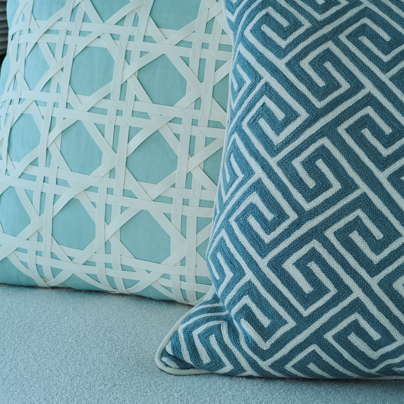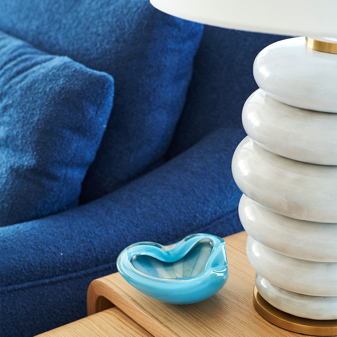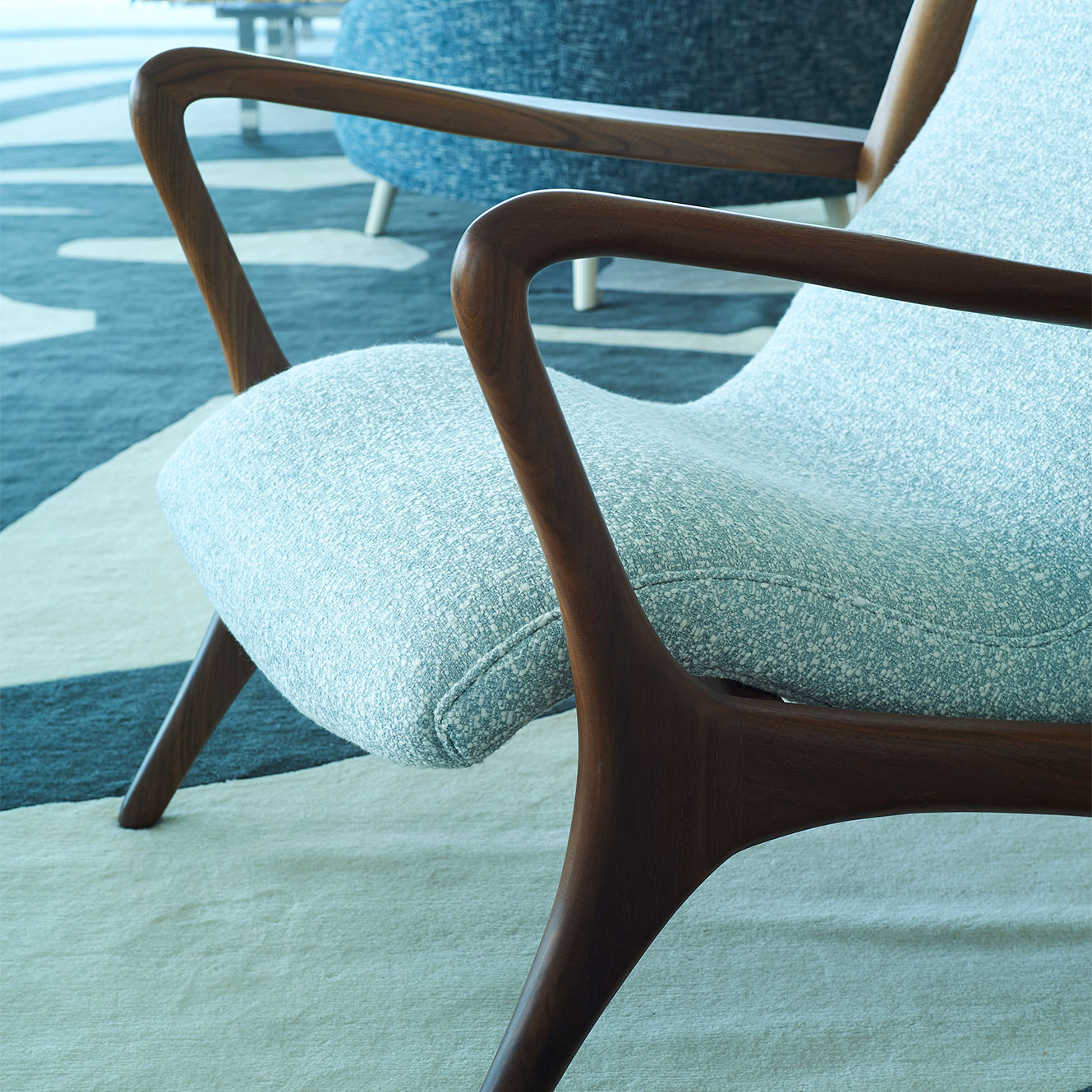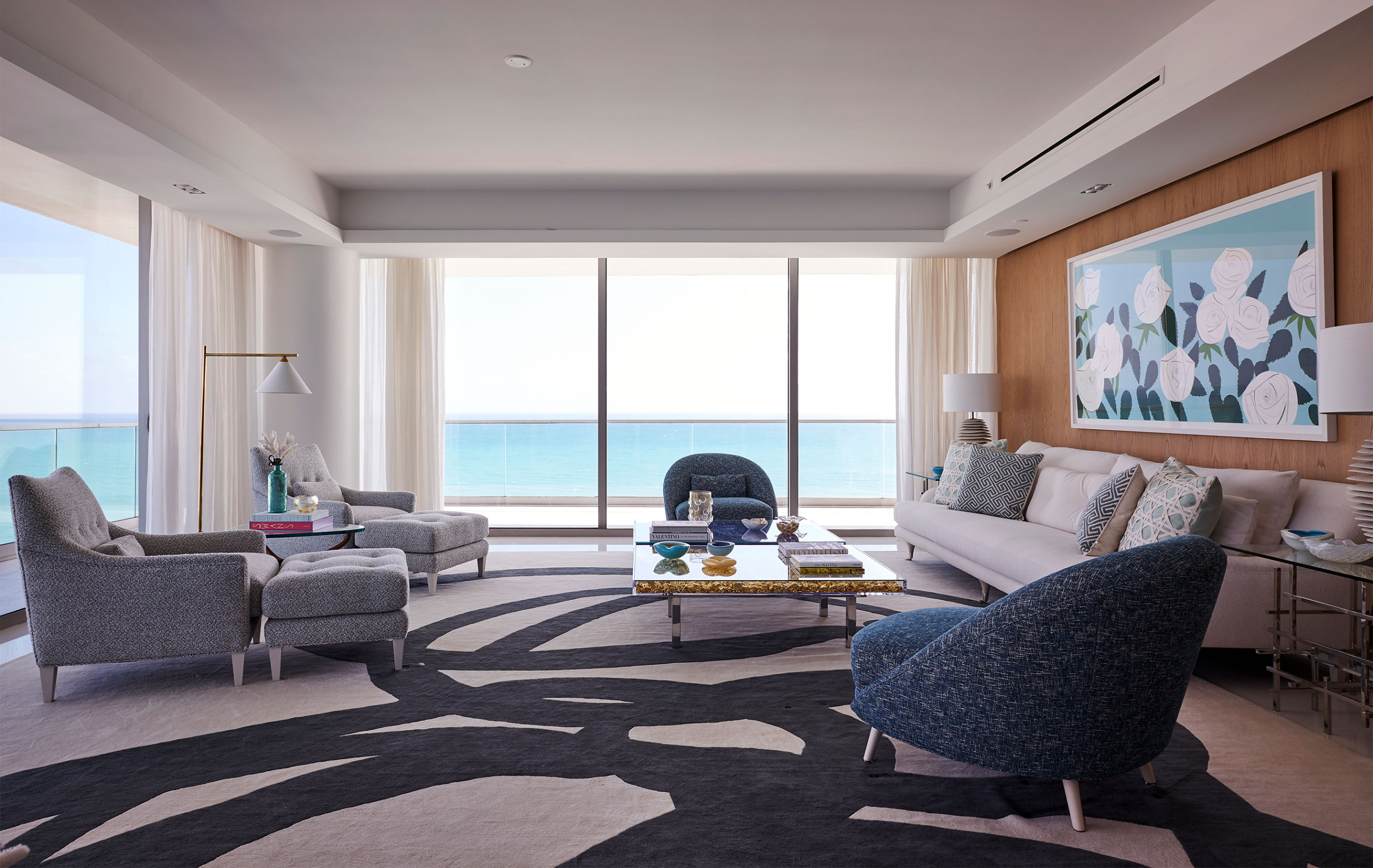 Concebido como refúgio beira-mar para uma família com quem Sig e Murilo trabalham há mais de duas décadas, o projeto transforma o apartamento em uma casa acolhedora. O mar orienta a composição por meio de superfícies claras, texturas táteis e uma paleta de azuis. Nos livings, o tapete azul-marinho e off-white de desenho orgânico organiza o mobiliário, com sofás em bouclé azul e poltronas de linhas orgânicas.