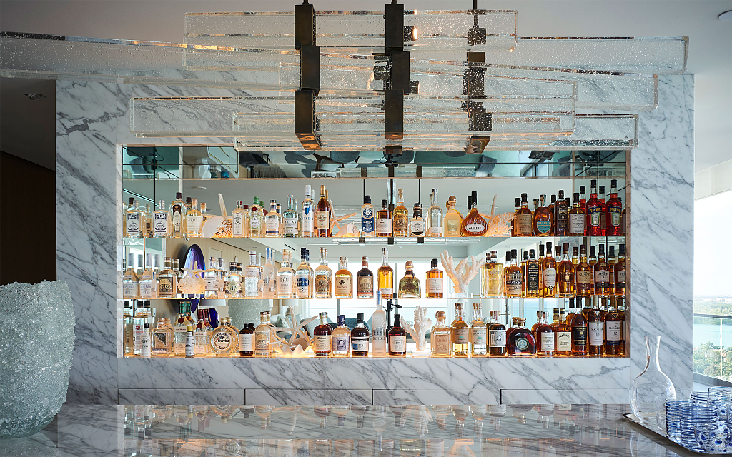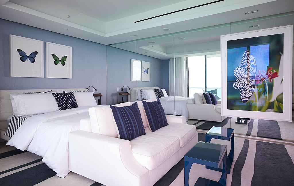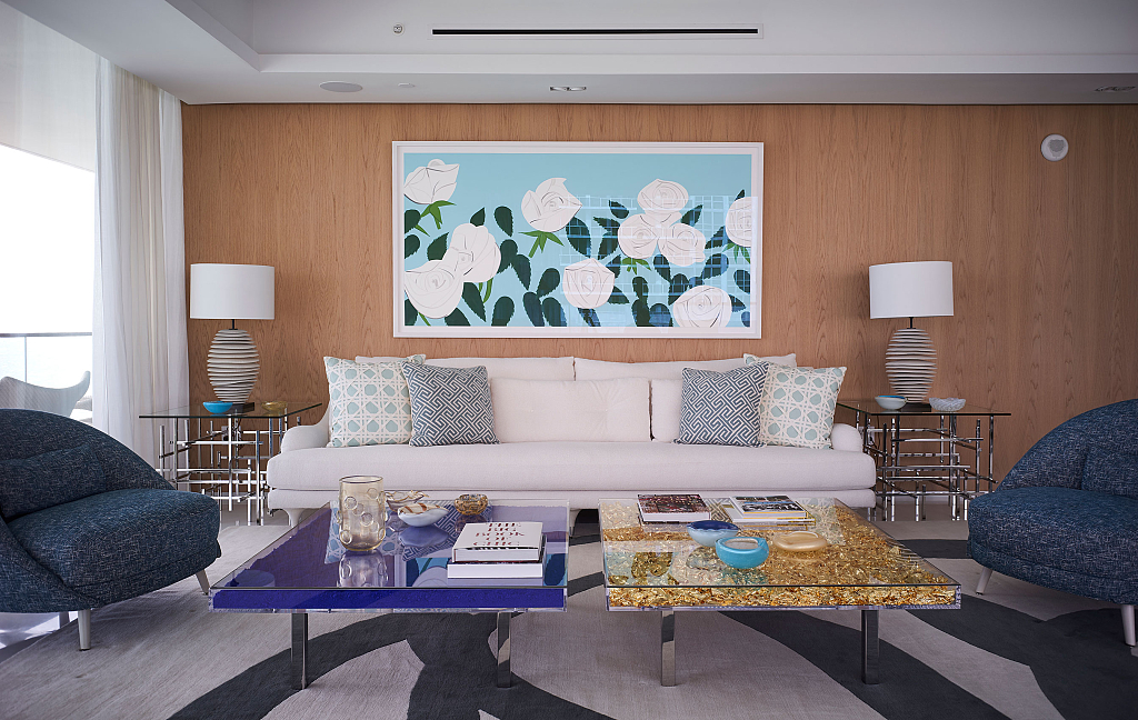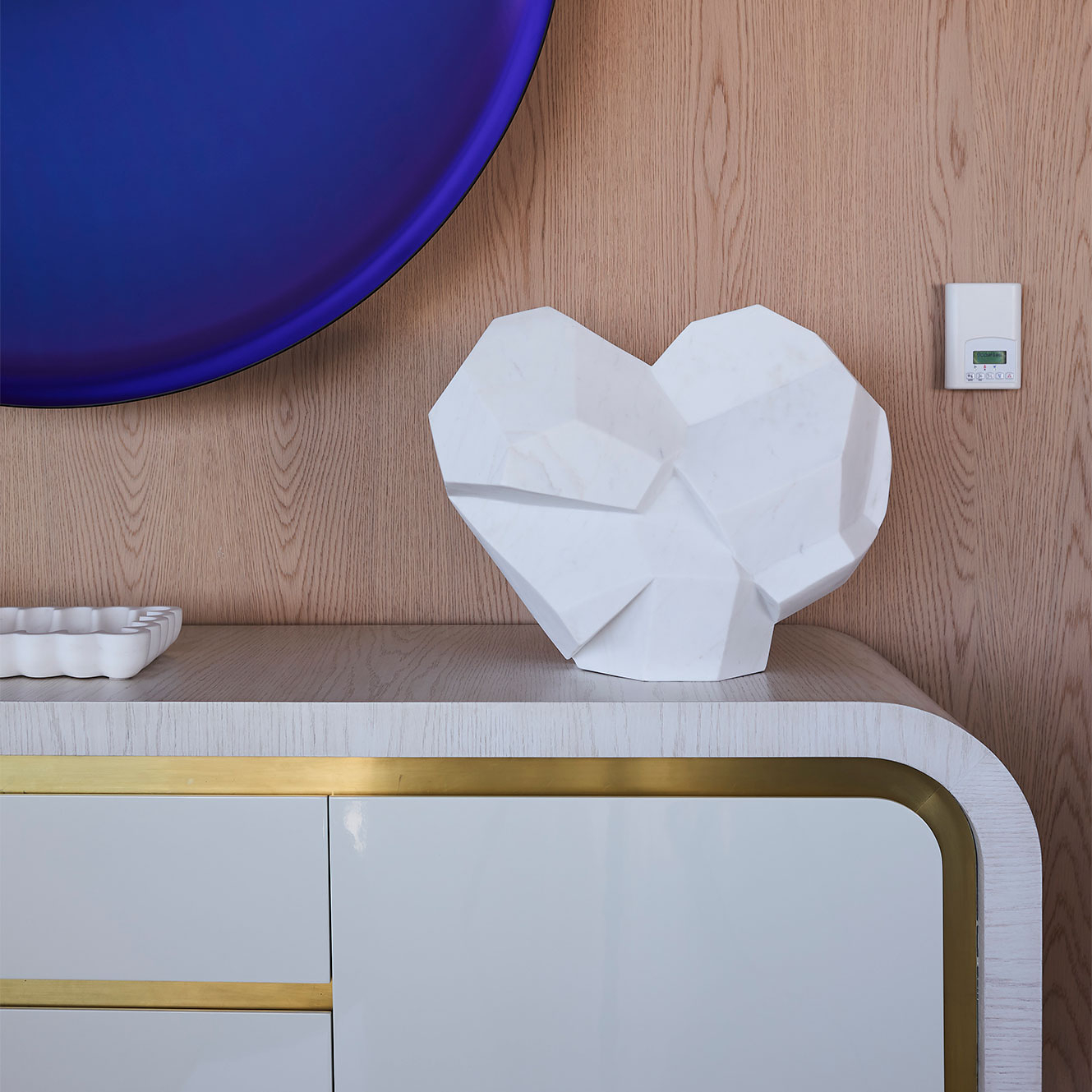 A curadoria combina ícones mid-century e peças contemporâneas, com destaque para Vladimir Kagan, Patrick Naggar e o conjunto de mesas Yves Klein. Inteiramente em mármore, o bar se afirma como elemento arquitetônico, acompanhado por lustre de placas de vidro e vaso soprado. A paleta de azuis, verdes e neutros se mantém nas áreas íntimas: na suíte principal, aparece em base clara com acentos mais intensos; na segunda suíte, um verde suave é pontuado por abajur Kelly Wearstler. Obras de Gerhard Richter, Alex Katz, Damien Hirst e Tom Wesselmann percorrem os ambientes e, junto a objetos de vidro soprado, cerâmicas vintage e esculturas, revelam a assinatura de Sig na sobreposição de estilos e épocas, elevando cada ambiente à categoria de manifesto vivo, onde arte, matéria e tempo se encontram em plena potência.