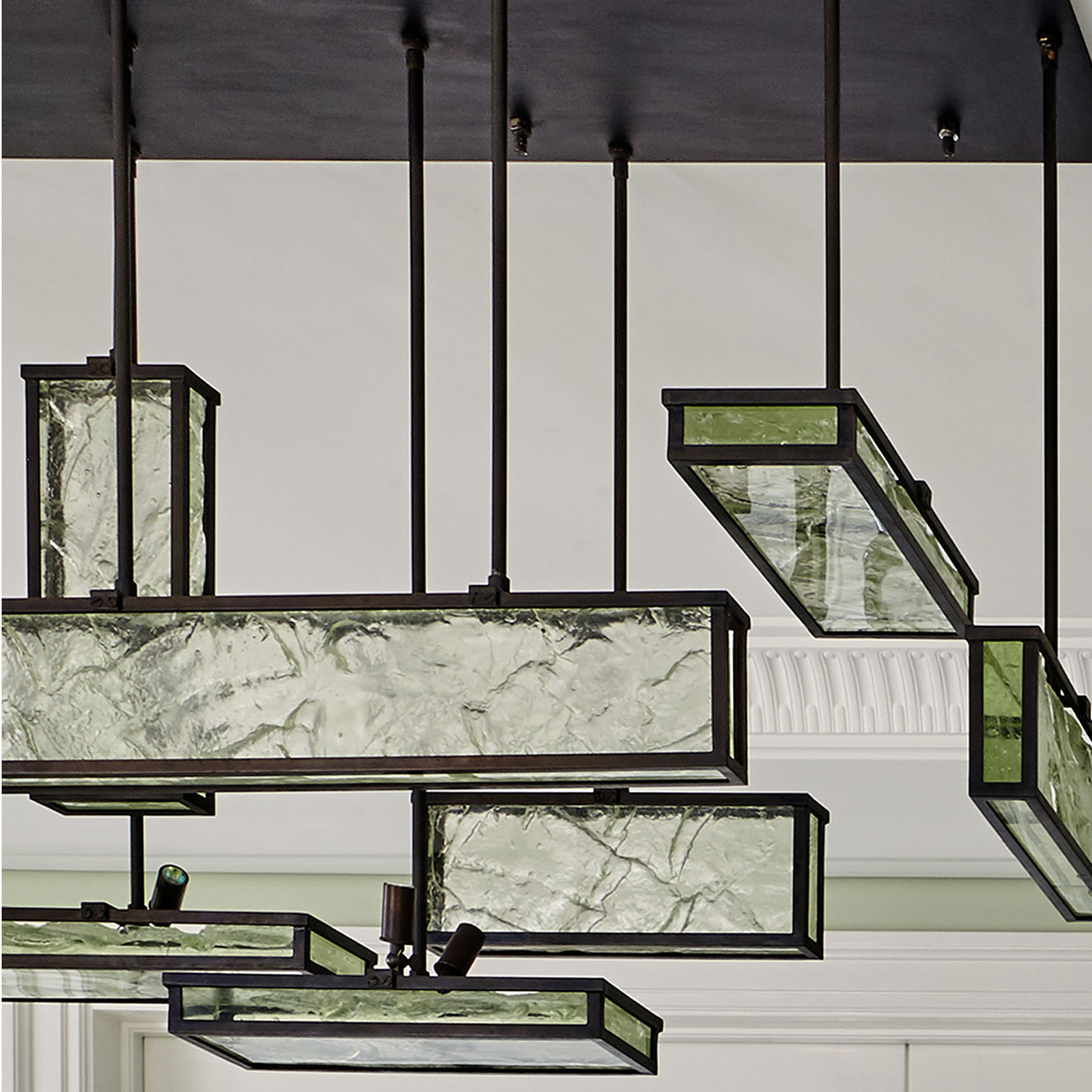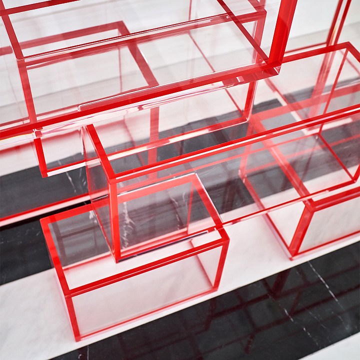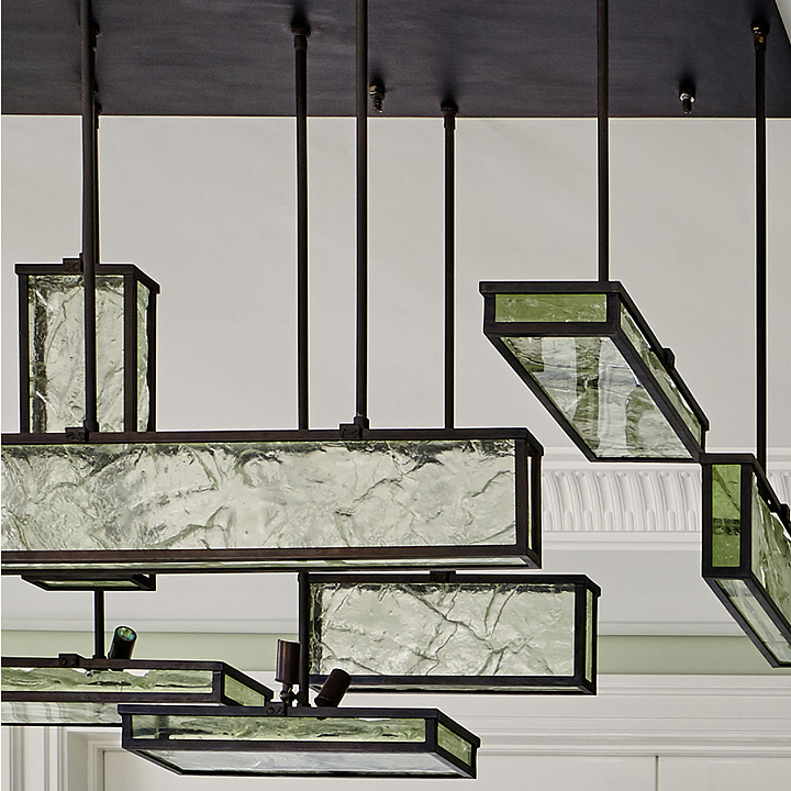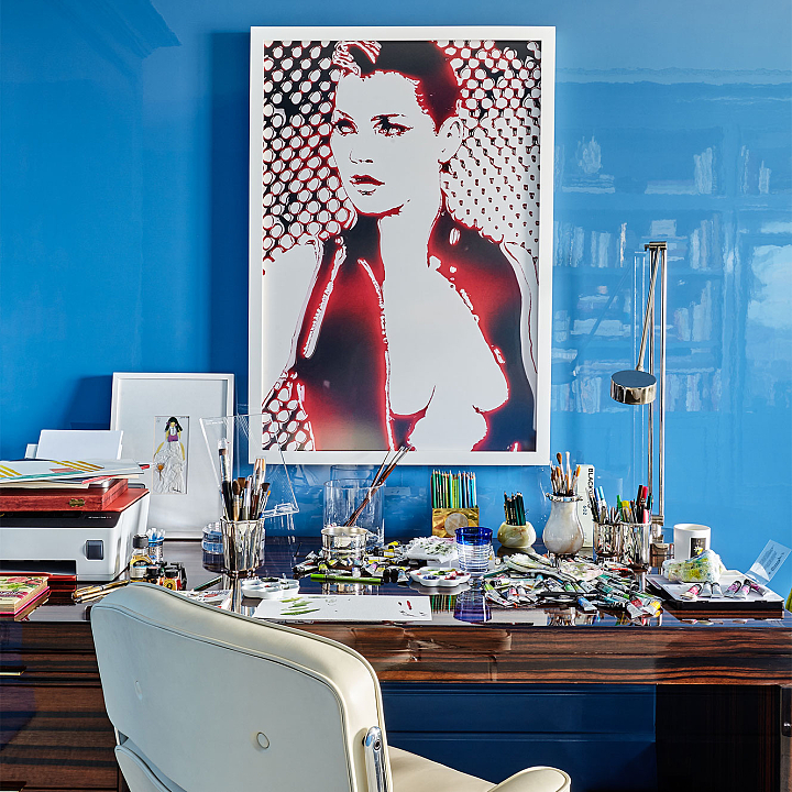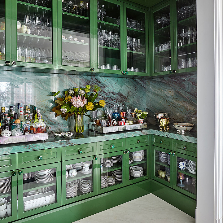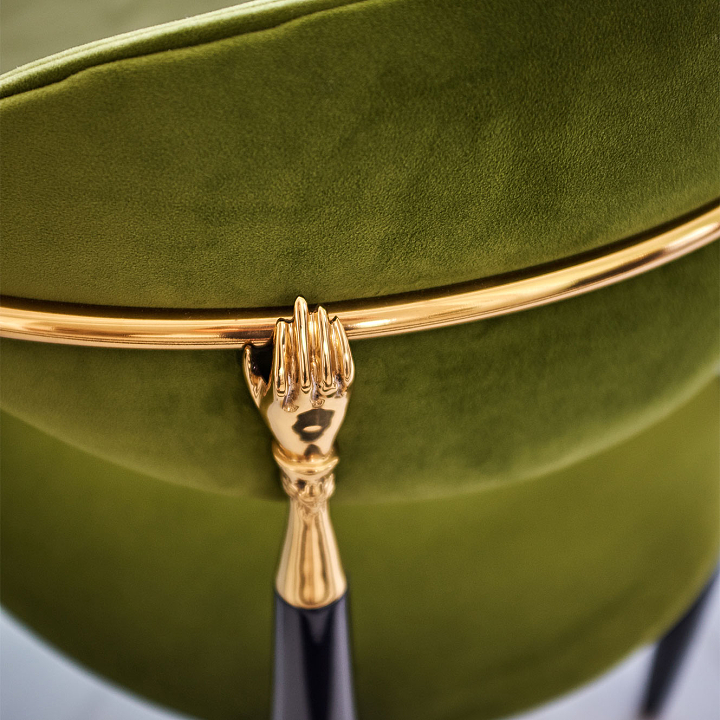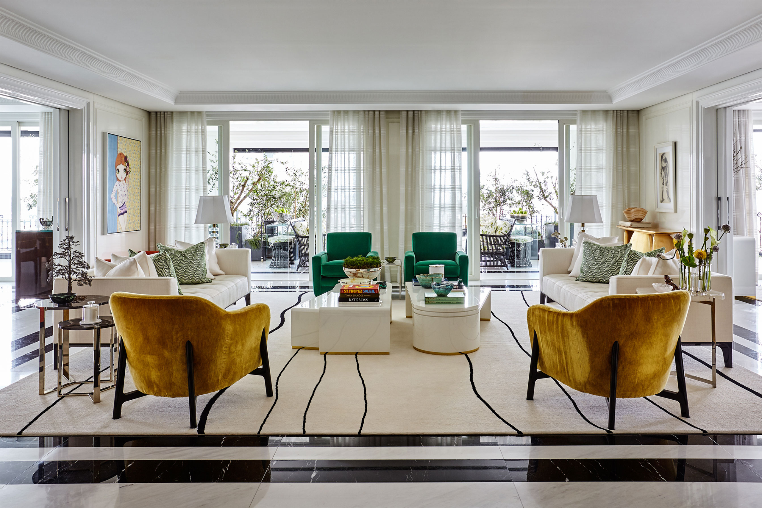 Urbano e cosmopolita, este apartamento constrói seu impacto a partir de uma base clássica em preto e off-white, sobre a qual arte e mobiliário assumem protagonismo com clareza curatorial. O interior se organiza em cenas nas quais obra, peça e acabamento compartilham o mesmo peso. No hall de entrada, o aparador geométrico de Hervé Van der Straeten dialoga com o piso de mármore em paginação linear, definindo um ponto de tensão reforçado por obra de Os Gêmeos. A combinação entre desenho, materialidade e escala introduz o vocabulário do projeto. No escritório-biblioteca, a marcenaria em azul envolve o ambiente e organiza livros, objetos e arte. A escrivaninha em ébano com acabamento dourado se articula com poltrona executiva em couro off-white e cadeira de acrílico estofada em veludo azul, calibrando o contraste entre peso material e transparência. Nos ambientes de convívio, o verde funciona como fio condutor. Poltronas em veludo verde dialogam com planos de cor, enquanto mesas de mármore e objetos em vidro atuam como pausas gráficas. No bar, esse registro se intensifica na marcenaria detalhada e no mármore de veios marcados. Na sala de jantar, poltronas de design italiano revestidas em veludo verde estruturam a composição ao redor da mesa, enquanto o lustre escultórico em vidro e bronze trata a luz como elemento arquitetônico. Intervenções em acrílico vermelho introduzem ritmo contemporâneo sem romper a unidade do conjunto. O resultado é um interior autoral.