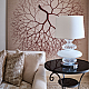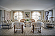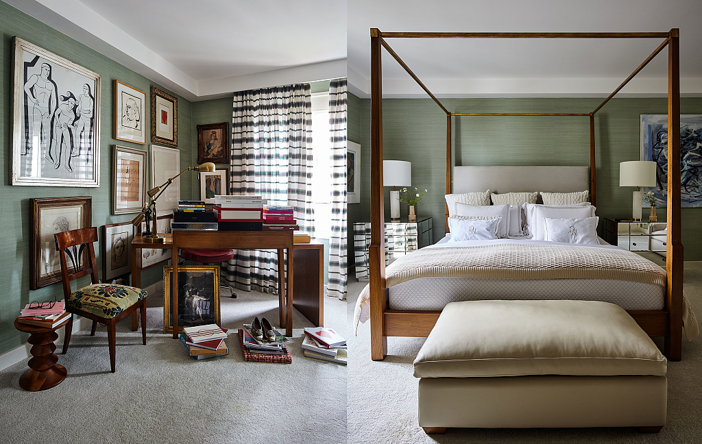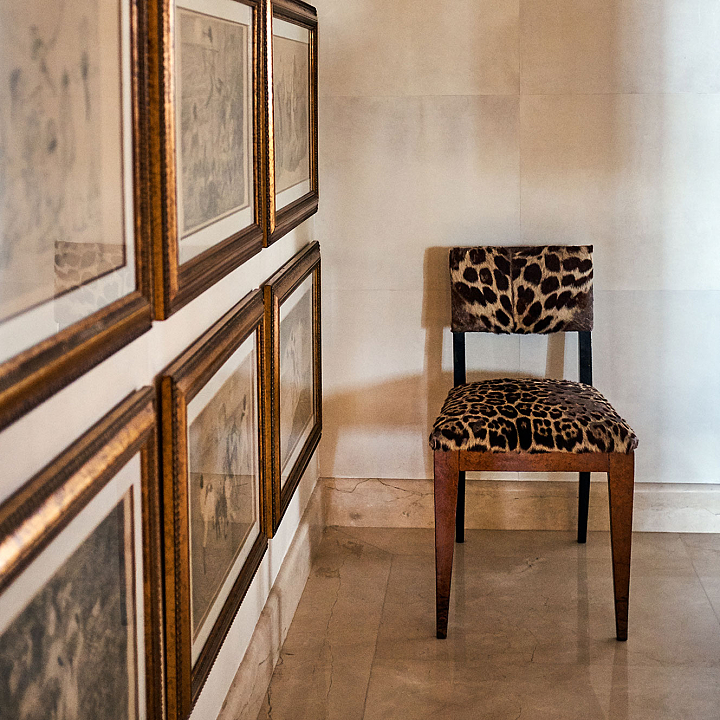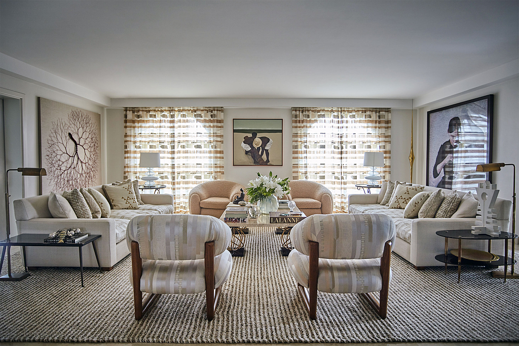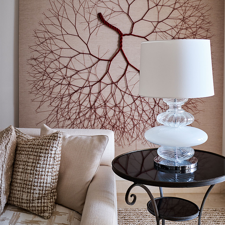 Neste apartamento, a arquitetura de interiores parte de uma base clássica para construir uma atmosfera de silêncio visual. A organização privilegia proporção, simetria e continuidade, criando uma estrutura que permite à arte e ao mobiliário assumirem protagonismo. A paleta de off-whites, beges e verdes suaves estabelece um fundo sobre o qual texturas ganham relevância. Cortinas em tecido Byblos, da Nobilis, adicionam densidade ao living, enquanto poltronas recebem revestimentos geométricos Babelia, da Dedar, e Opio Orzo, da Pierre Frey, compondo um jogo entre matéria e grafismo. A arte estrutura o espaço com precisão curatorial. Obras de Wallace Pato, Vik Muniz, Lescher e Janaina Mello Landini definem eixos visuais e ritmo compositivo, assumindo papel arquitetônico. No living, a luminária pendente Atomic atua como ponto focal, complementada pela floor lamp 24 Karat Blau, com folhas de ouro, enquanto a pintura de Daniel Senise reforça a dimensão gráfica do conjunto. O mobiliário, predominantemente mid-century e moderno, combina volumes e linhas limpas em madeira, pedra natural e tecidos encorpados. Elementos clássicos, como a cama com dossel, são reinterpretados com desenho essencial. O uso pontual de preto e dourado introduz contraste e profundidade. O resultado é um interior concebido como composição contínua, onde arquitetura, arte e design operam em sintonia.